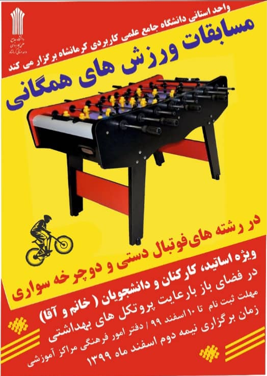 به گزارش روابط عمومی دانشگاه علمی کاربردی استان کرمانشاه: واحد استانی این دانشگاه در نظر دارد مسابقات ورزشهای همگانی ویژه اساتید ،کارکنان و دانشجویان (خانم و آقا ) در رشته های فوتبال دستی و دوچرخه سواری را با رعایت پروتکل های بهداشتی در نیمه دوم اسفند ماه سالجاری برگزار نماید.