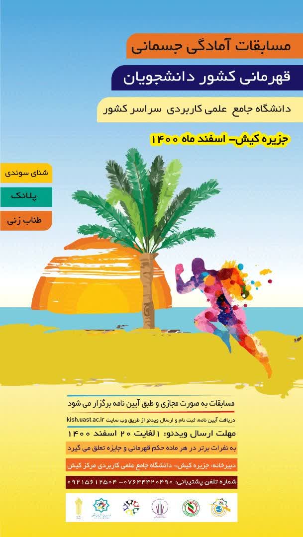 هشتمین دوره مسابقات آمادگی جسمانی دانشجویان دختر و پسر دانشگاه جامع علمی کاربردی به میزبانی مرکز آموزش علمی کاربردی کیش به صورت مجازی برگزار می شود.